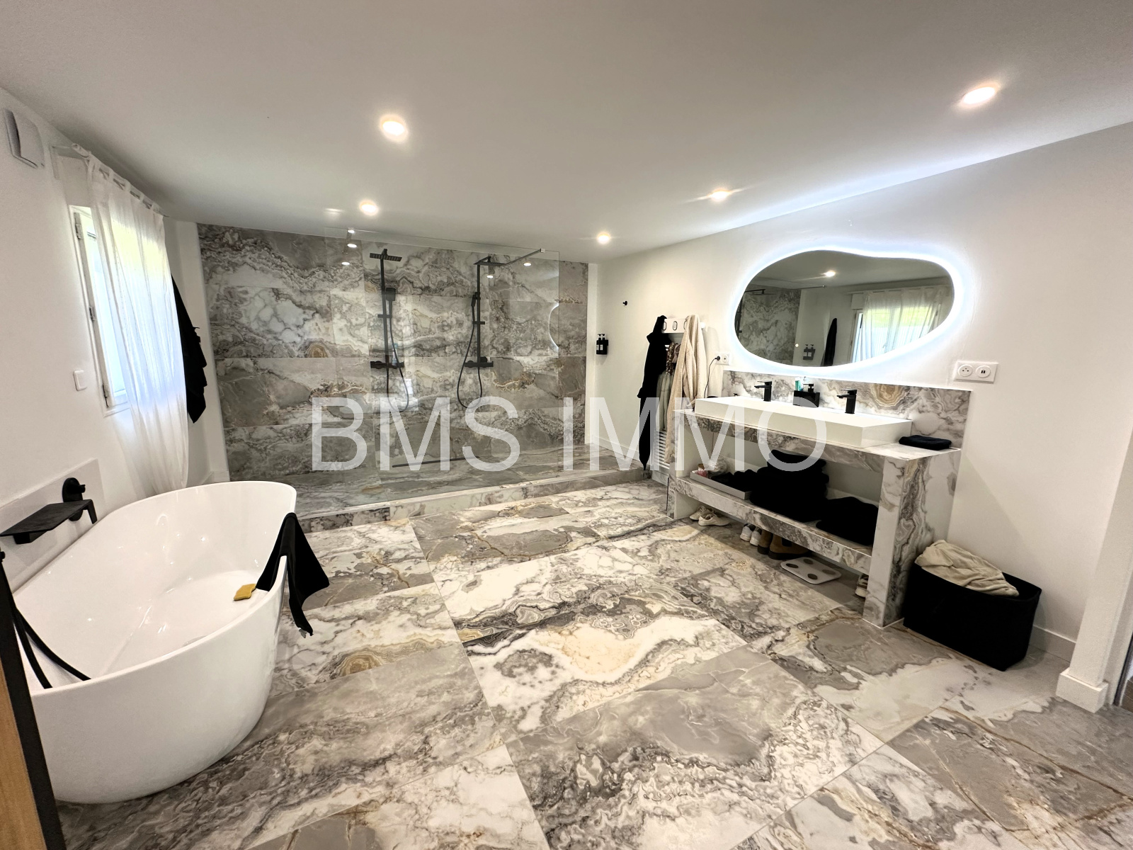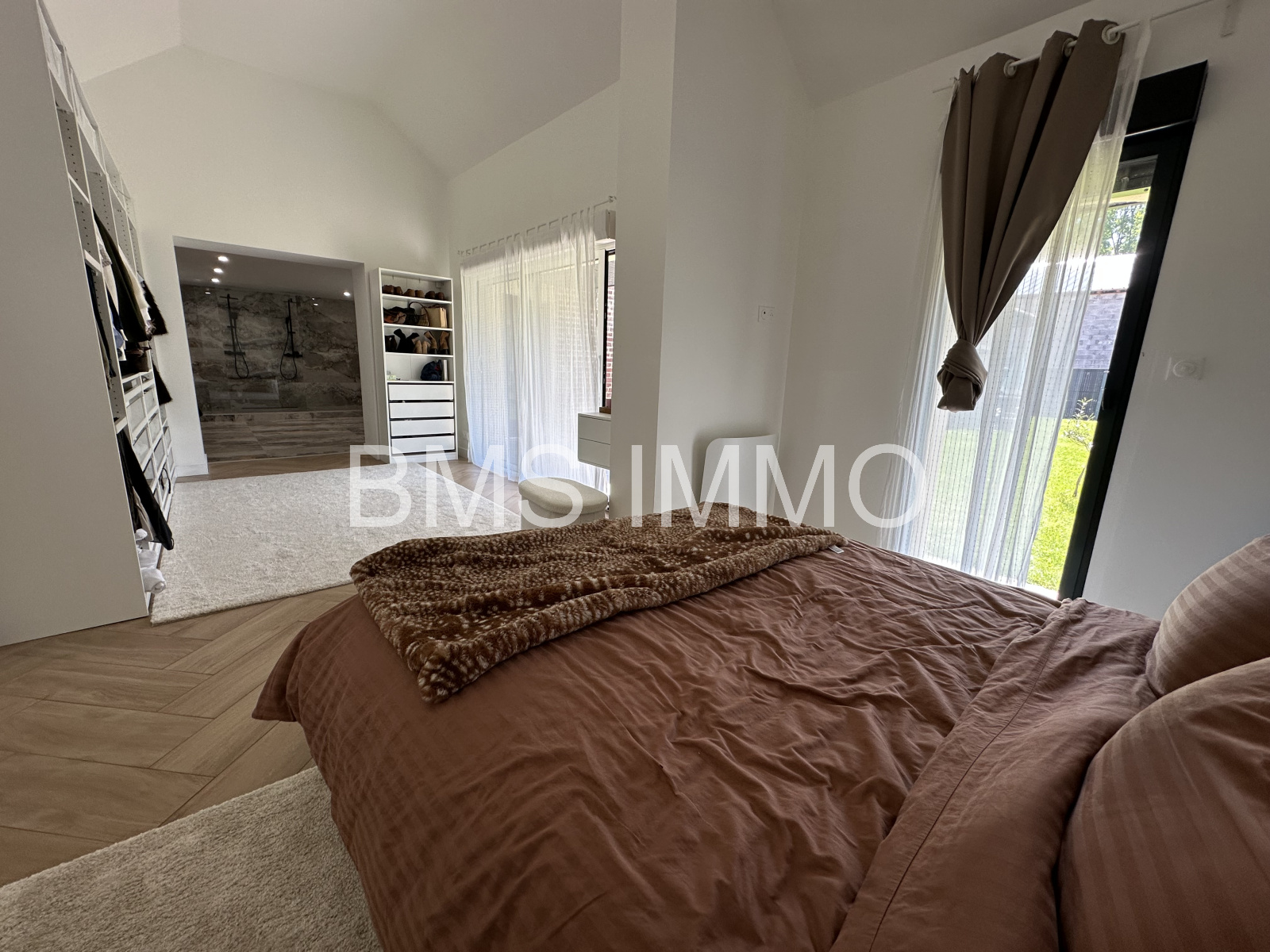 Située au calme, elle se compose au rez de chaussée d'une magnifique pièce de vie très lumineuse de plus de 80m², avec sa cuisine équipée, d'une grande buanderie, et d'une très belle suite parentale d'environ 45m²composée d'une chambre avec son dressing et d'une spacieuse salle de bains avec deux douches à l'italienne et baignoire.