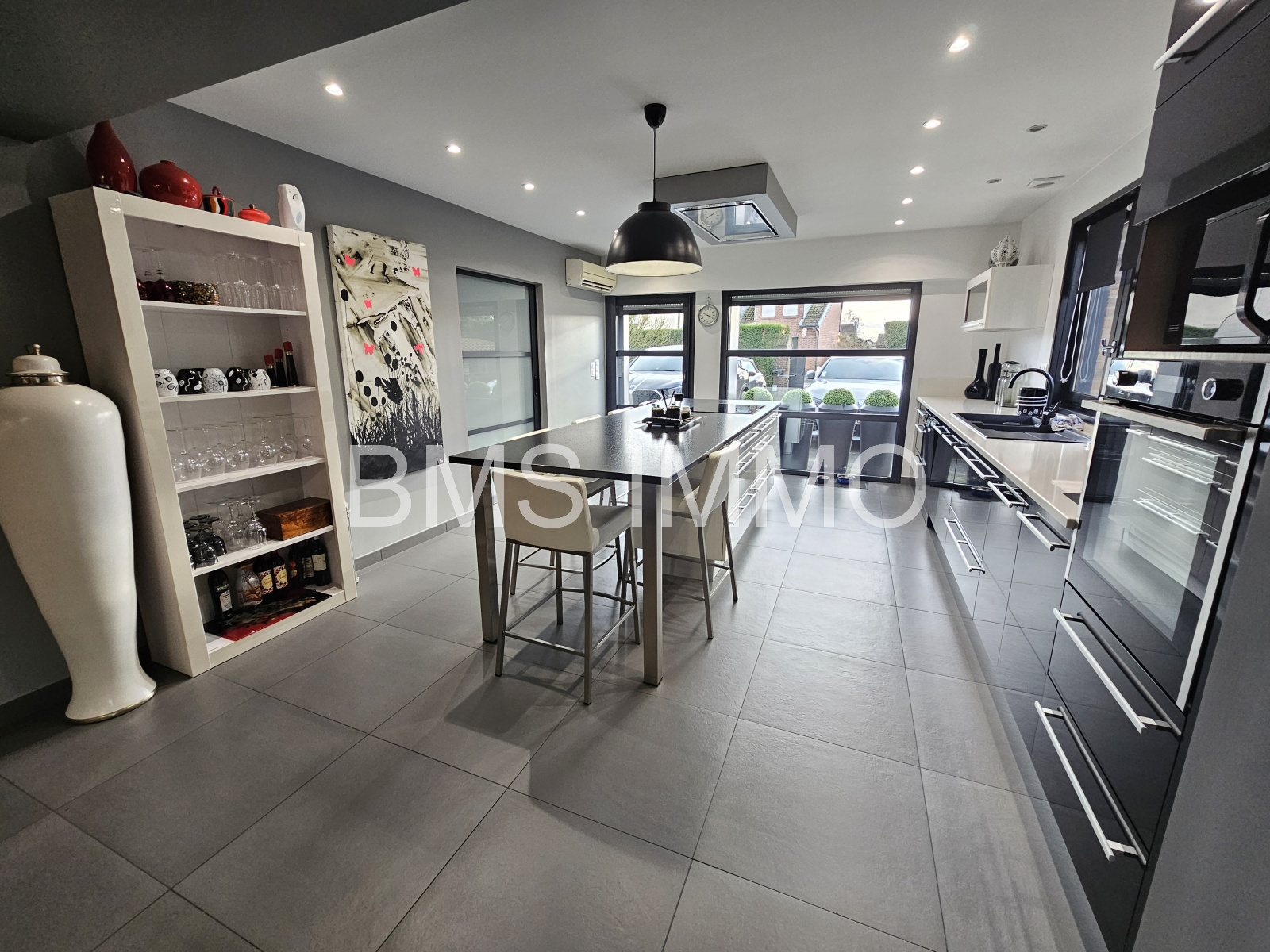 Le rez-de-chaussée se compose d'une large entrée avec rangements, une pièce de vie d'environ 90 m² comprenant un espace cuisine, salon ainsi qu'une salle à manger et une arrière cuisine.